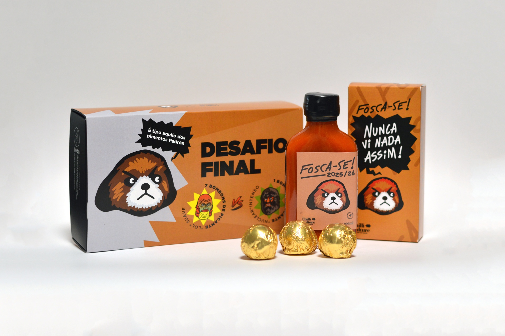 Cabaz de Natal Inclui: 1 Molho Picante FOSCA-SE (100 ml) + 1 Caixa de Bombons DESAFIO FINAL (110gr)